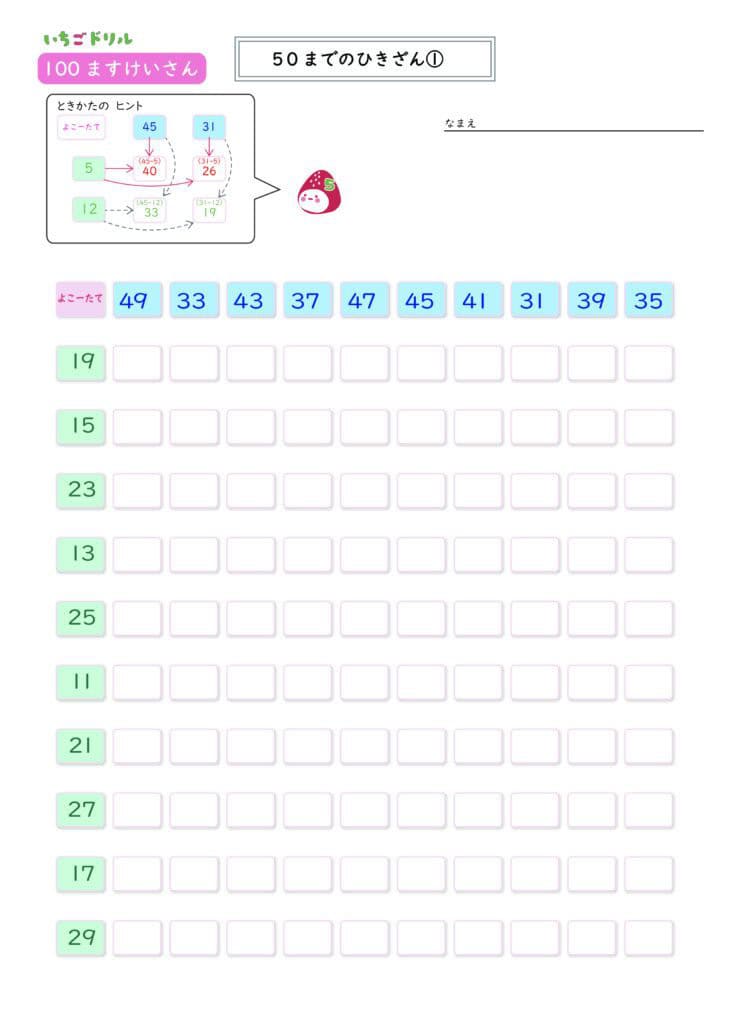 100マス計算50までのひきざん