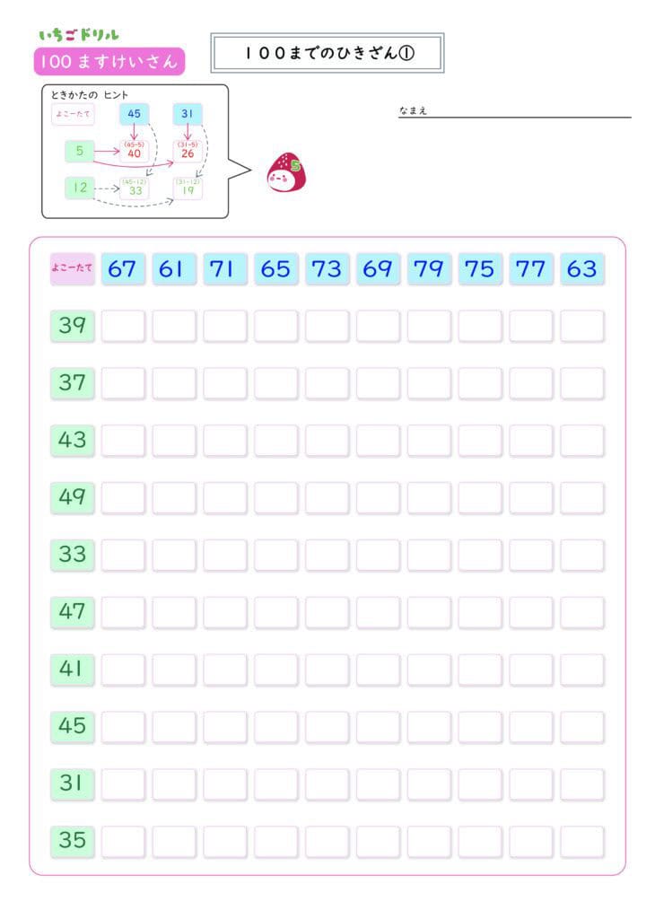 100マス計算100までのひきざん