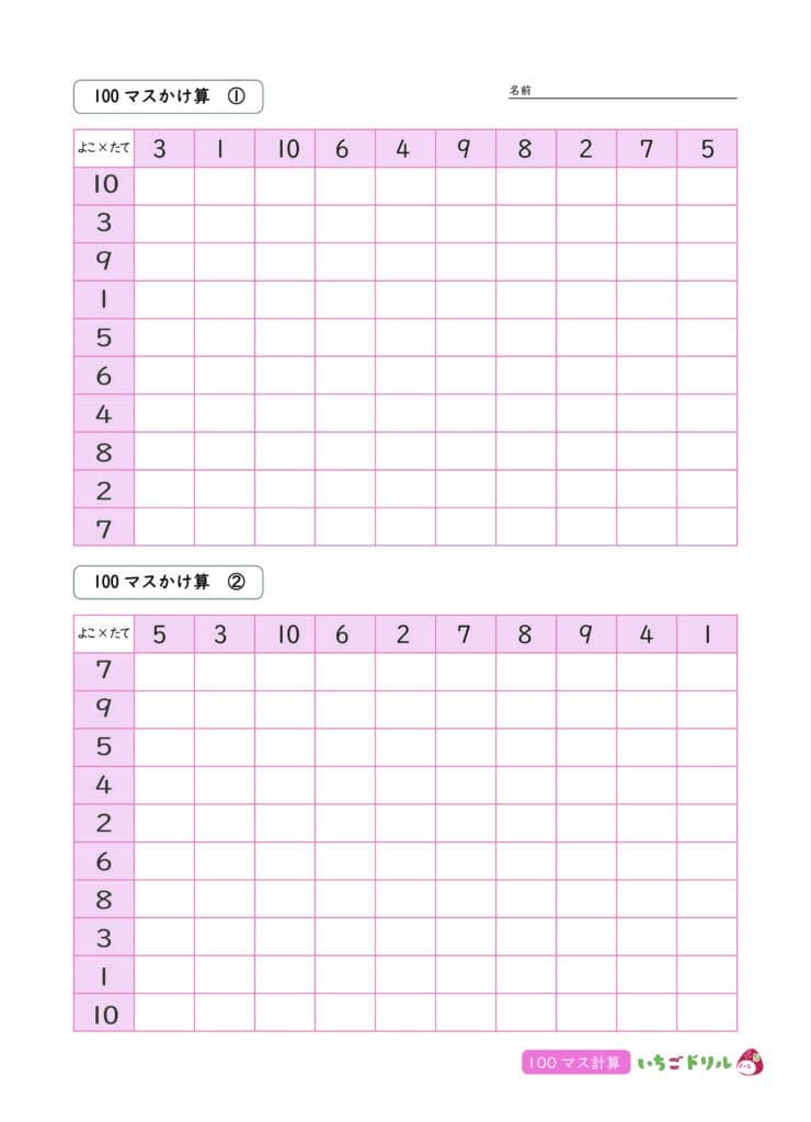 10までのかけ算の100ます計算です。九九を覚えたころに取り組むと、計算力アップ!また、テストのような問題形式に飽きてしまっても、100ます計算にすると楽しんで取り組むことができるかも?