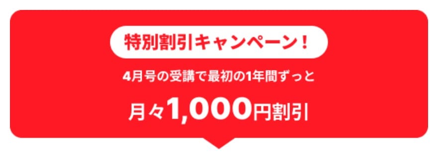 通常2か月以上受講しないといけないところ、1月号入会者は1か月のみの受講もOK。また通常6か月以上受講しないとタブレット代が発生しますが、1月号入会者は退会時に端末を返却すればタブレット代0円です。受講費1,500円引きと合わせると超オトクなキャンペーン。お試し感覚で気軽に始められるので、入会を迷っていた人は今がチャンスです!