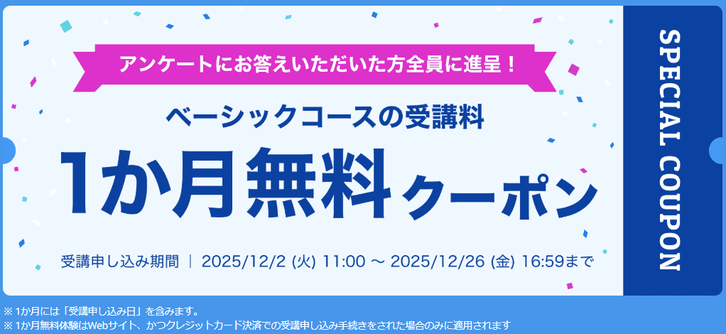 【2025年6月】アンケート回答でベーシックコース1ヶ月無料キャンペーンコードが貰える