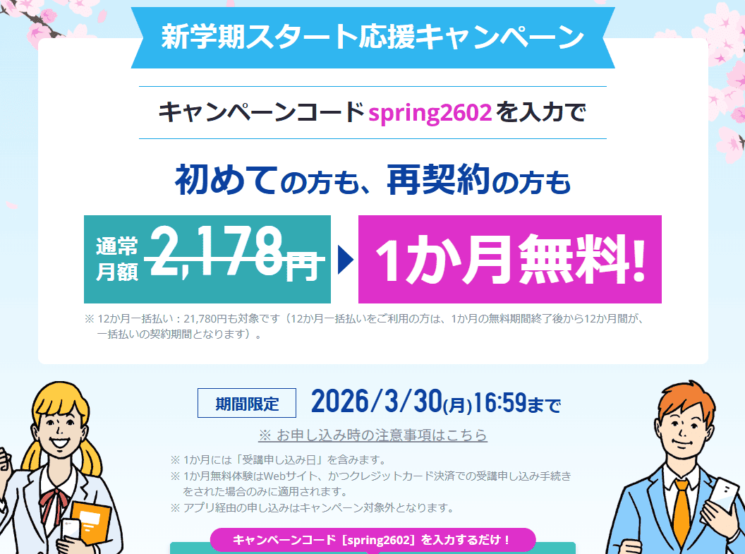 新学期スタート!キャンペーンコード入力で1ヶ月無料