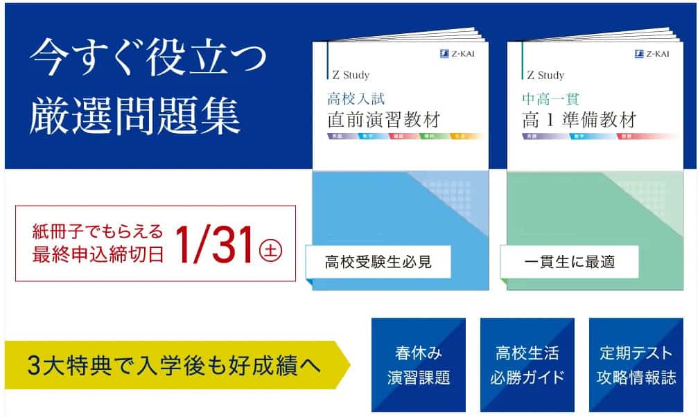Z会各コースの入会キャンペーン・特典でおさえておきたいのはZ会はいつでも1ヶ月から受講できること。入会金無料で違約金も不要です。Z会では時期や年代に応じた入会キャンペーンを実施。期間限定の入会特典がついてくることもあるので、キャンペーン内容は要チェックです。入会前には資料請求をお忘れなく!Z会の資料請求でもらえるお試し教材は内容・量ともに無料と思えない充実ぶり。資料請求で教材内容やシステムを確認しておけば、損せずにはじめられます
